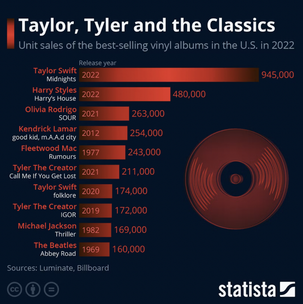 ในปี 2022 ที่ผ่านมายอดขายแผ่นเสียงไวนิลนั้นพุ่งทะยานสูงกว่าซีดีในสหรัฐอเมริกาเป็นครั้งแรกในรอบ 35 ปีนับตั้งแต่ปี 1987 จากรายงานของสมาคมอุตสาหกรรมแผ่นเสียงแห่งอเมริกา (Record Industry Association of America) พบว่ามีการขายแผ่นเสียงไวนิลมากกว่า 41 ล้านแผ่นในปี 2022 คิดเป็นมูลค่า 1,200 ล้านเหรียญสหรัฐO (ประมาณ 40,000 ล้านบาท) ส่วนยอดขายซีดีนั้นได้เพียง 33 ล้านแผ่น คิดเป็นมูลค่า 483 ล้านเหรียญสหรัฐฯ (ประมาณ 17,000 ล้านบาท)